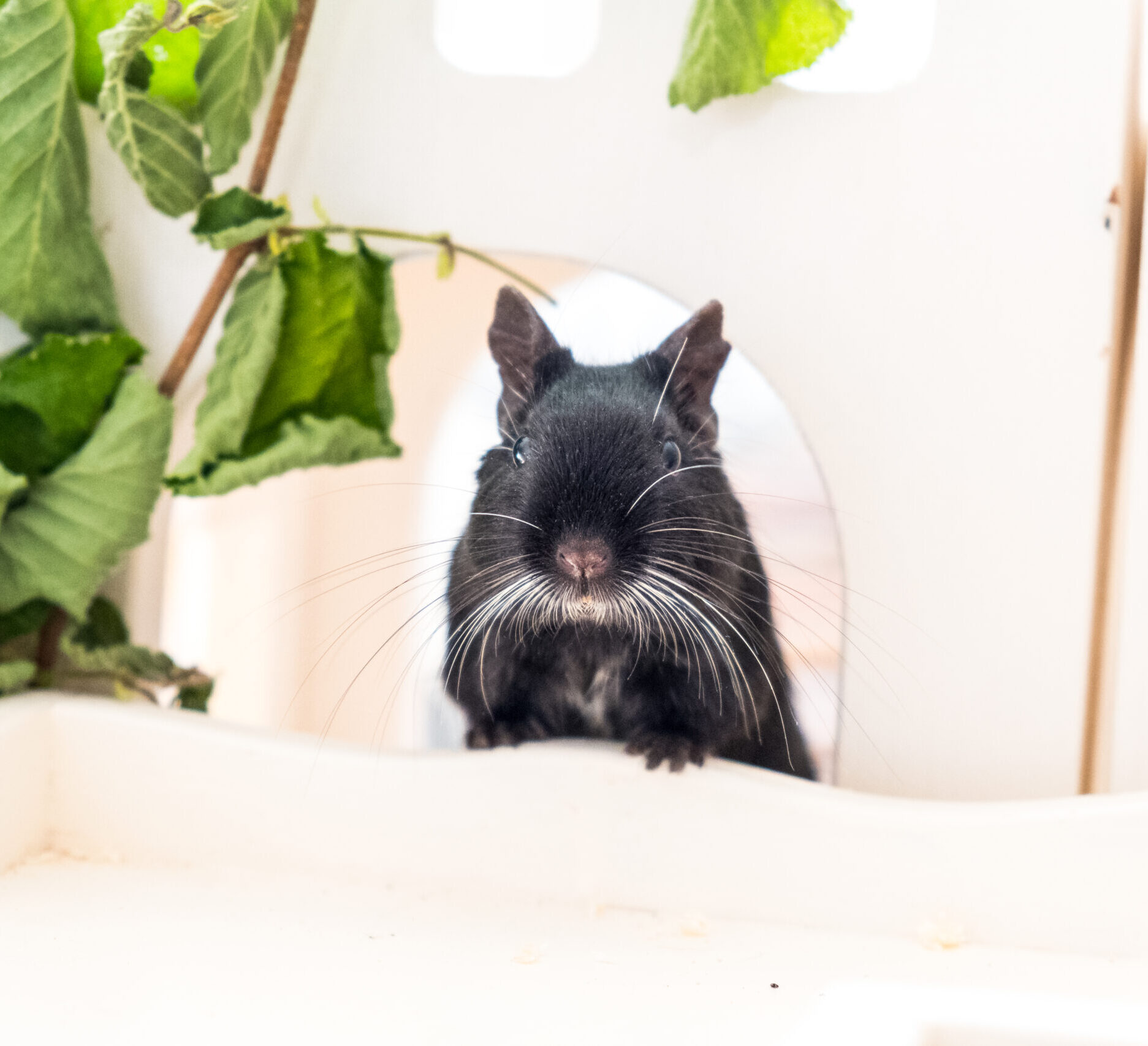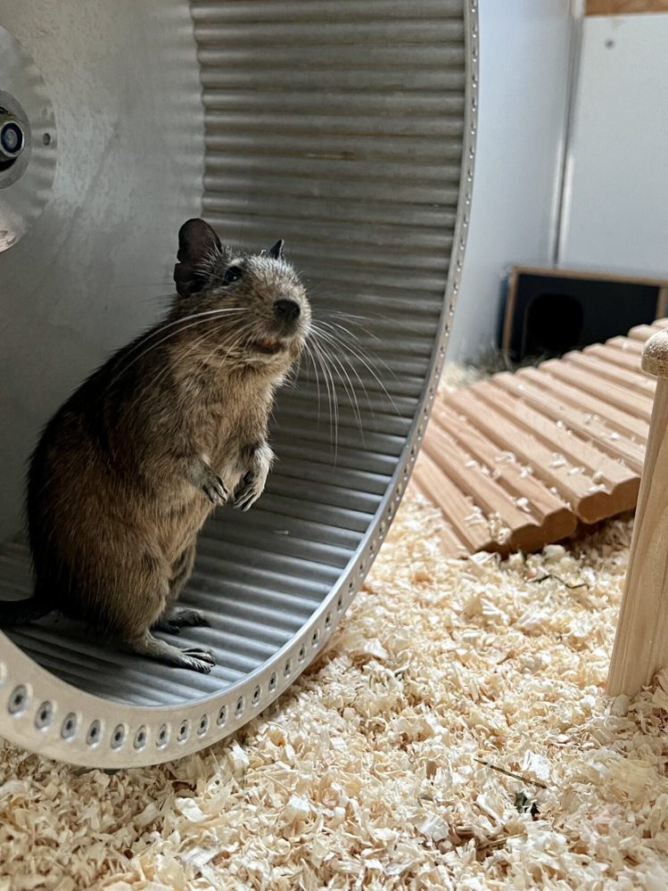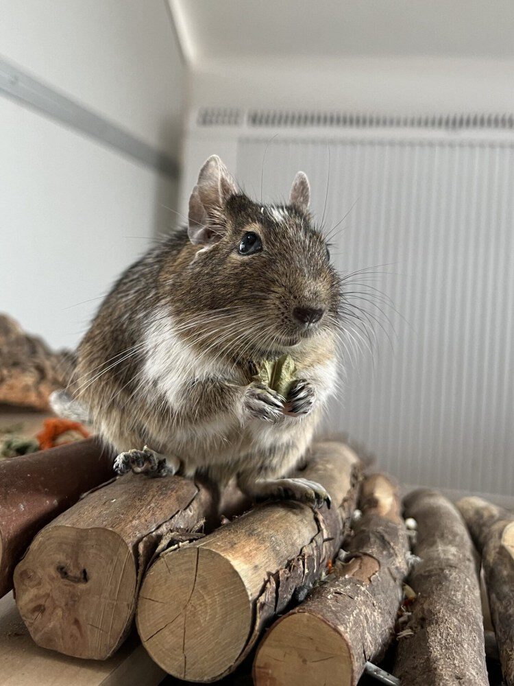 Degu Mio saß ein paar Monate im Tierheim und hat sehnsüchtig auf ein Zuhause gewartet. Degus sind nicht so leicht vermittelbar und zählen zum Glück eher zu den ,,Exoten” bei den Haustieren. Er wurde bei Fressnapf gekauft und nach ein paar Monaten hat er sich sehr doll mit seinen Kumpels bzw. Brüdern zerstritten. Mio hat einen Degu schwer verletzt. Im Tierheim wurde er kastriert und wartete dann Tag für Tag auf ein neues Zuhause. Mio war für einen Degu immer sehr laut. Er war viel in seinem Laufrad und hat gequietscht bzw. geschrien. Nachdem er nach Monaten immer noch ein Zuhause suchte, haben wir uns entschieden ihn aufzunehmen. Er wurde Teil unserer ,,Zickengruppe”. Conny und Lisa sind unsere beiden Divas und haben zusammen 25m². Sie haben uns schon so manches Mal einige Nerven gekostet. Mit schwachen und unterwürfigen Degus können die Divas nicht. Mio scheint sehr gut rein zu passen und nimmt die Zickereien von den beiden Damen nicht ernst.