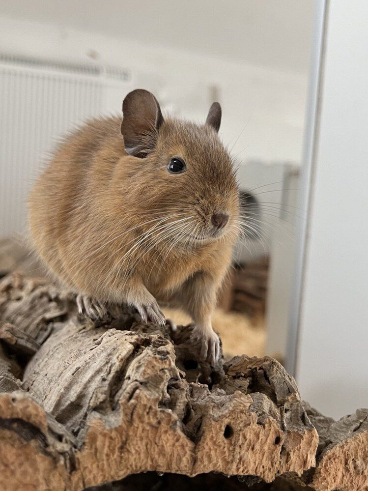 Fuchs kam im Sommer 2022 zu uns. Er wurde mit mehreren Degus zusammen ausgesetzt. Fuchs ist allgemein sehr scheu, aber hat auch Momente, wo er sehr zutraulich sein kann. Mit Leckerlis können wir ihn mittlerweile sehr gut bestechen. 😉 Er war eine Zeitlang schwerer Zahnpatient und die Chancen sahen sehr schlecht aus. Zum Glück hat er sich gefangen. Er hatte damals 2 Menschen so schwer gebissen, dass sie ins Krankenhaus mussten. Degubisse sind sehr schmerzhaft und tief. Zum Glück ist es seitdem nie wieder passiert.