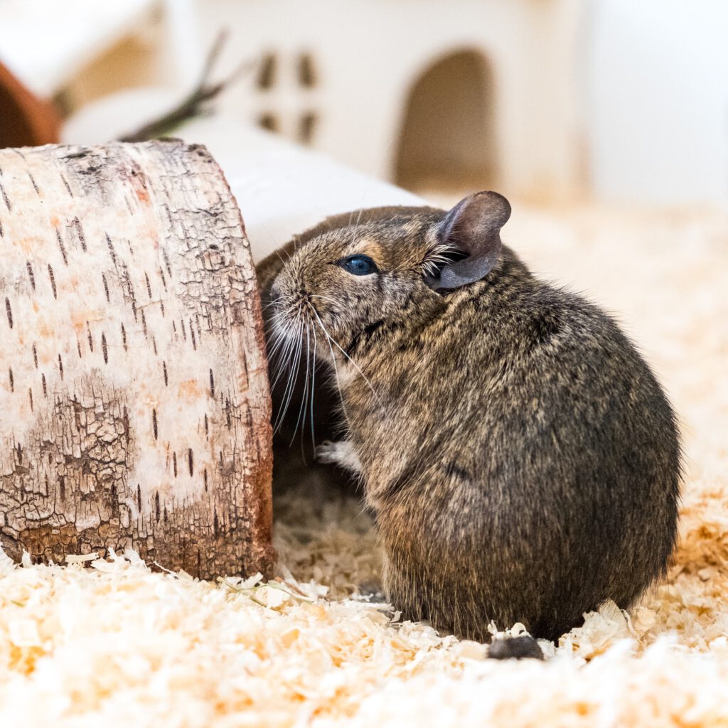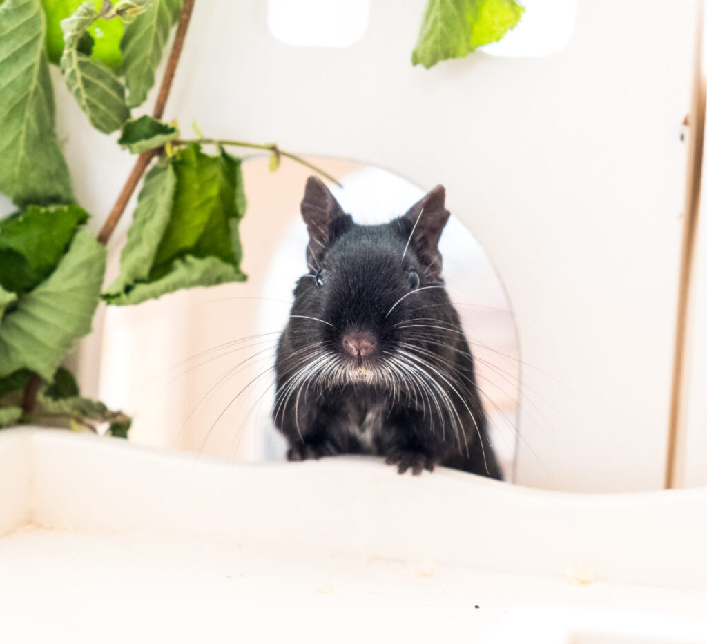 Alva kam im Sommer 2023 zu uns. Wir bekommen immer wieder Abgabeanfragen für Degus. Degus sind meist eher schwierig zu vermitteln. Zum Glück gibt es nicht so viele Menschen, die Degus Zuhause haben. Bei der Vermittlungen ist es deswegen eher schwierig. Alva war bei Einzug ca. 4 Jahre alt. Wir wussten schon seit mehreren Monaten, dass sie alleine ist, aber ihre Menschen konnten sich nicht von ihr trennen als wir Platz für sie hatten. Fast ein halbes Jahr später, als sie aus Einsamkeit immer mehr abbaute, meldeten sie sich wieder bei uns. Wir wollten unsere Gruppe eigentlich nicht weiter vergrößern, aber wir machten eine Ausnahme…Alva lebte sich total schnell ein und fühlt sich sehr wohl in der Gruppe. Soziale Tiere kann Einsamkeit richtig krank machen. Manchen sehen wir Menschen es vielleicht nicht an, aber sie leiden still.