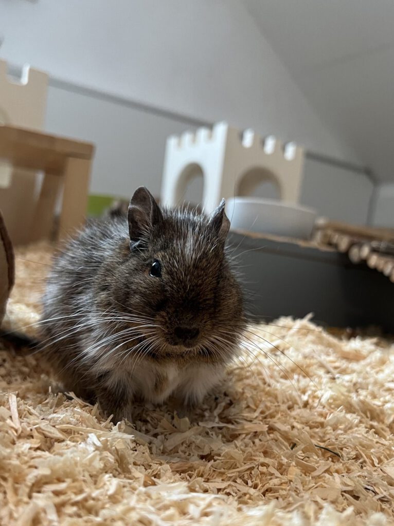 Schließlich starteten wir einen Versuch mit der anderen Degugruppe und dort klappte es direkt. Kaum Auseinandersetzungen und keine Verletzungen. Nun lebt sie im großen Deguzimmer mit 3 weiteren Degus. Vivian ist teilweise etwas panisch und sehr ängstlich. Bei unseren Ritualen wie dem abendlichen Brei, vertraut sie uns und kommt direkt zu uns. Auch mal eine Erbsenflocke aus der Hand, lässt ihre Angst vergessen. Kommen wir aber zu ungewohnten Uhrzeiten und machen etwas sauber, dann hat sie große Angst.