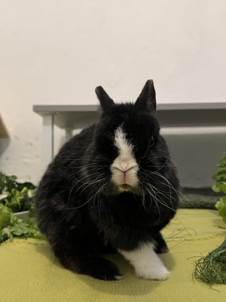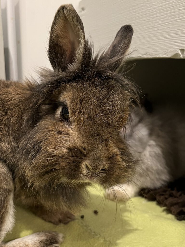 Hansi kam 2022 zu uns. Er kam ins Tierheim als mit 28 anderen Kaninchen als Sicherstellung. Hansi war jedoch der einzige, der offensichtlich krank und gehandicapt war. Beide Augen waren und sind immer noch verändert. Ein Auge musste schließlich entfernt werden. Das andere Auge wird dauerhaft krank bleiben und bekommt immer Augentropfen. Im Weiteren hat er eine Fehlstellung der Hinterbeine, wodurch er nicht richtig hoppeln kann. Springen kann er auch nicht. Hansi kommt aber gut mit seinen Handicaps klar und möchte trotzdem Chef der Gruppe sein. Er lebt mit sechs weiteren Kaninchen im Renter/- und Handicapzimmer. Er wird ein dauerhafter Patient sein, aber genießt sein Leben im 20qm Kaninchenzimmer.
